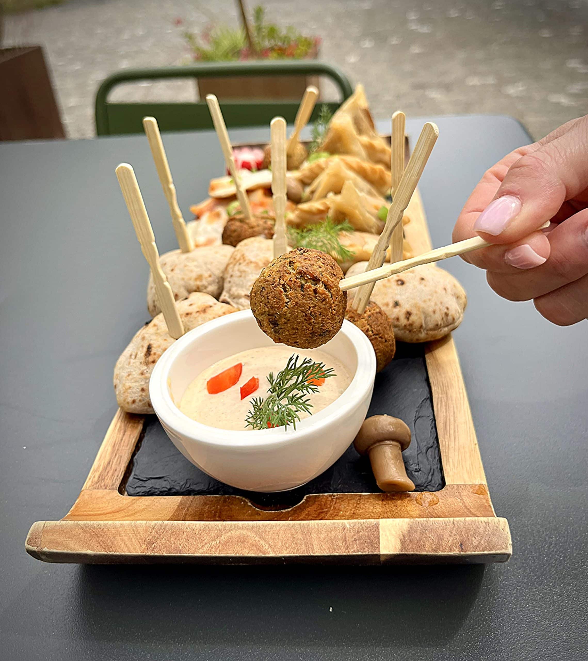 4x empanadas végé – 4x toasts de baba ganoush – 4x Samoussa – 4x borek – 4x falafels quesadillas au chorizo et au fromage