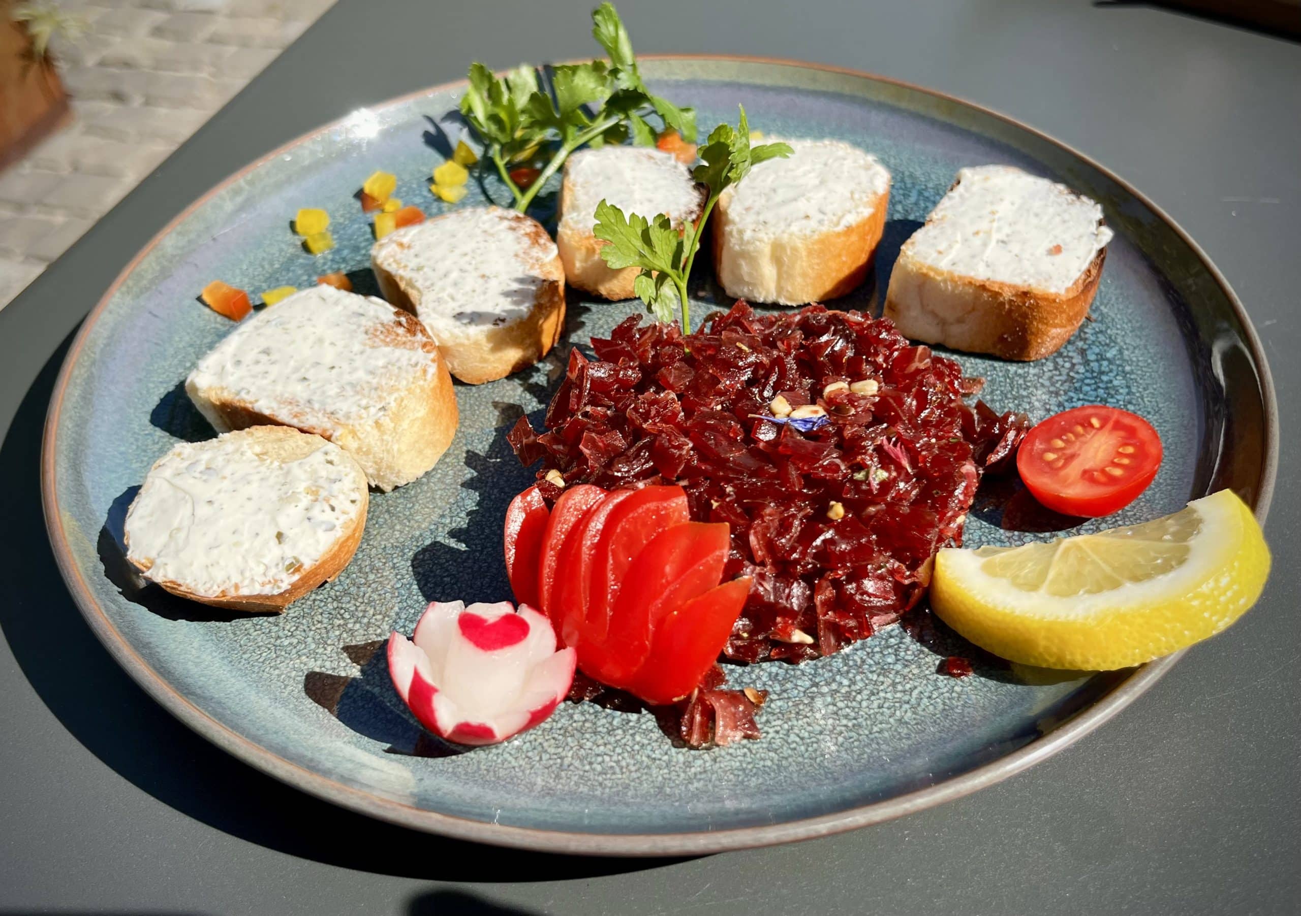 4x tartare de viande séchée – 4x toasts de baba ganoush et tomates séchées – 4x kotlety 4x samoussa à la viande